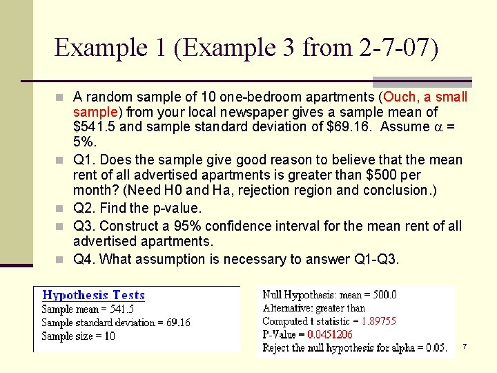 Example 1 (Example 3 from 2 -7 -07) n A random sample of 10 one-bedroom apartments (Ouch, a small n n sample) from your local newspaper gives a sample mean of $541. 5 and sample standard deviation of $69. 16. Assume a = 5%. Q 1. Does the sample give good reason to believe that the mean rent of all advertised apartments is greater than $500 per month? (Need H 0 and Ha, rejection region and conclusion. ) Q 2. Find the p-value. Q 3. Construct a 95% confidence interval for the mean rent of all advertised apartments. Q 4. What assumption is necessary to answer Q 1 -Q 3. 7