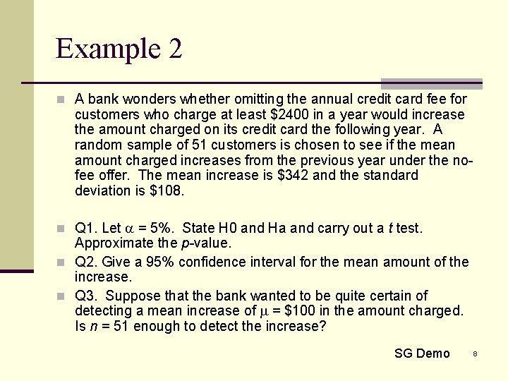 Example 2 n A bank wonders whether omitting the annual credit card fee for customers who charge at least $2400 in a year would increase the amount charged on its credit card the following year. A random sample of 51 customers is chosen to see if the mean amount charged increases from the previous year under the nofee offer. The mean increase is $342 and the standard deviation is $108. n Q 1. Let a = 5%. State H 0 and Ha and carry out a t test. Approximate the p-value. n Q 2. Give a 95% confidence interval for the mean amount of the increase. n Q 3. Suppose that the bank wanted to be quite certain of detecting a mean increase of m = $100 in the amount charged. Is n = 51 enough to detect the increase? SG Demo 8