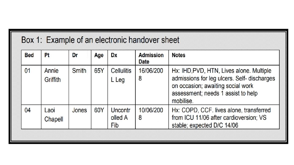 Elemen Penilaian SKP. 2. 2 1. Ada bukti catatan tentang hal-hal kritikal dikomunikasikan diantara profesional pemberi asuhan pada waktu dilakukan serah terima pasien (hand over). (D, W) (lihat juga MKE. 5) 2. Formulir, alat, metode ditetapkan untuk mendukung proses serah terima pasien (hand over) bila mungkin melibatkan pasien. (D, W) 3. Ada bukti dilakukan evaluasi tentang catatan komunikasi yang terjadi waktu serah terima pasien (hand over) untuk memperbaiki proses. (D, W)