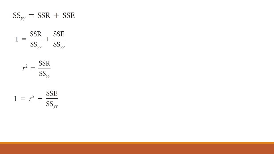 o Variasi ini dapat dibagi menjadi dua penjumlahan variasi : the explained variation, diukur dengan Sum of Squares Of Regression (SSR), dan the unexplained variation, diukur dengan Sum Square Error (SSE)