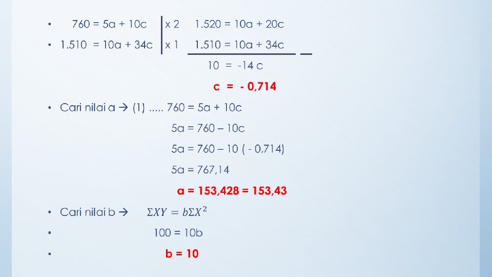 n Tahun Jualan (Y) X XY 1 2011 130 -2 -260 4 520 16 2 2012 145 -1 -145 1 3 2013 150 0 0 4 2014 165 1 5 2015 170 2 340 4 680 16 Ʃ 760 0 10 1. 510 34 Cara Eliminasi digunakan untuk kedua persamaan di atas untuk memperoleh nilai a dan b lihat slide berikutnya