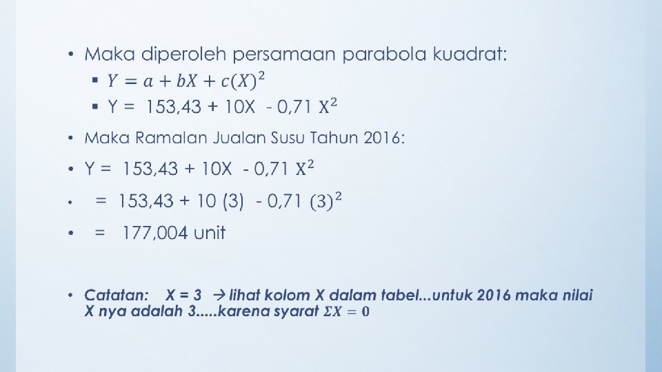 Contoh 2 (Tren parabola kuadrat) • Diasumsikan produk susu PT. IMMA merupakan produk bukan permintaan turunan • Diketahui data dari hasil penjualan susu dari PT. IMMA selama 5 tahun terakhir (yaitu tahun 2011, 2012, 2013, 2014, 2015), masing-masing sebesar 130 unit, 145 unit, 150 unit, 165 unit, 170 unit • Buatlah ramalan penjualan dengan menggunakan analisis tren parabola kuadrat untuk tahun 2016