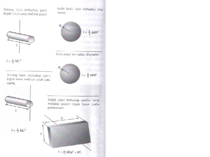 • Momen Inersia (rotasi) massa (translasi) Untuk sistem partikel energi kinetiknya : I disebut momen inersia dari sistem partikel Untuk benda tegar momen inersianya dapat dihitung dari :