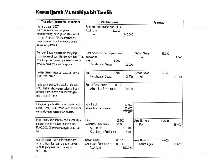 Berakhirnya akad Ijarah 1. 2. 3. 4. 5. Periode akad sudah selesai sesuai perjanjian Periode akad belum selesai tapi pemberi sewa dan penyewa sepakat menghentikan akad ijarah Terjadi kerusakan aset Penyewa tidak dapat membayar sewa Salah satu pihak meninggal & ahli waris tidak ingin meneruskan akad.