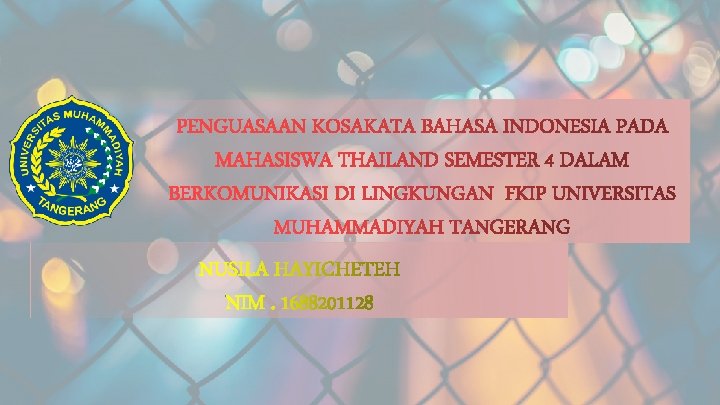 BAB I PENDAHULUAN A. Latar Belakang Cara berkomunikasi sehari-hari mahasiswa Thailand terhadap orang yang di lingkungan Fakultas Keguruan dan Ilmu Pendidikan Universitas Muhammadiyah Tangerang merupakan peristiwa berkomunikasi yang sangat menarik untuk peneliti, maka penulis membuat judul Pengusaan Kosakata Bahasa Indonesia Pada Mahasiswa Thailand Semester 4 Dalam Berkomunikasi di Lingkungan FKIP Universitas Muhammadiyah Tangerang.
