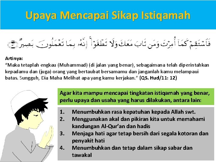 Upaya Mencapai Sikap Istiqamah Artinya: “Maka tetaplah engkau (Muhammad) (di jalan yang benar), sebagaimana telah diperintahkan kepadamu dan (juga) orang yang bertaubat bersamamu dan janganlah kamu melampaui batas. Sungguh, Dia Maha Melihat apa yang kamu kerjakan. ” (QS. Hud/11: 12) Agar kita mampu mencapai tingkatan istiqamah yang benar, perlu upaya dan usaha yang harus dilakukan, antara lain: 1. 2. 3. 4. Menumbuhkan rasa kepatuhan kepada Allah swt. Menggunakan akal dan pikiran kita untuk memahami kandungan Al-Qur’an dan hadis Menjaga hati agar tetap bersih dari segala kotoran dan penyakit hati Menumbuhkan dan tetap dalam sikap sabar dan tawakal