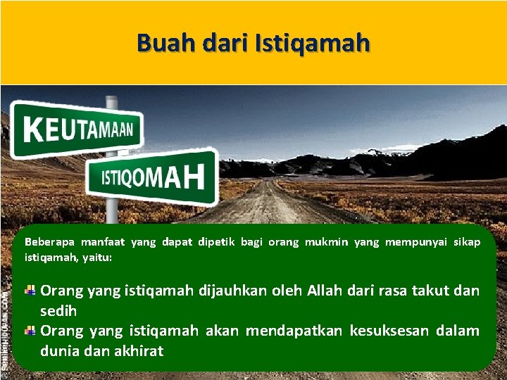 Buah dari Istiqamah Beberapa manfaat yang dapat dipetik bagi orang mukmin yang mempunyai sikap istiqamah, yaitu: Orang yang istiqamah dijauhkan oleh Allah dari rasa takut dan sedih Orang yang istiqamah akan mendapatkan kesuksesan dalam dunia dan akhirat
