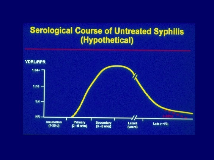 Interpretation of Changing STS Titers Error of RPR VDRL Tests - + 1 dilution Meaningful change is 2 dilution (or 4 -fold) change in titer e. g. 1: 2 1: 4 or 1: 1, no meaningful change 1: 2 1: 8, meaningful change Quantitative RPR or VDRL test, results are not interchangeable Two dilution decline in titer indicates response to therapy however, failure to decline > 2 dilutions does not necessarily mean patient has failed treatment