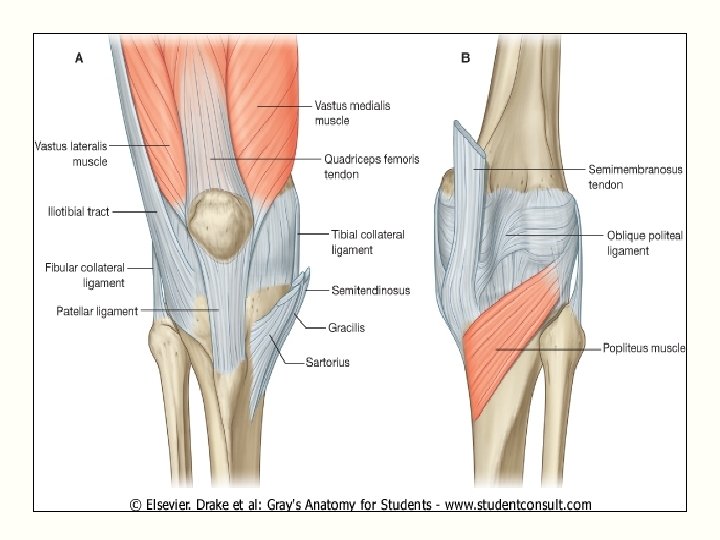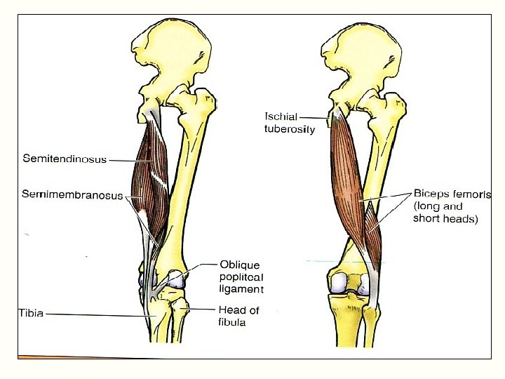 • You should remember the following: • The hamstrings are the main Flexors of the knee, but they are also, Extensors of the hip. • All hamstrings arise from Ischial tuberosity, Except Short head of biceps from linea aspera and lateral supracondylar ridge of the femur. • Biceps femoris inserted into head of the Fibula. • Semimembranosus inserted into a groove in the back of medial tibial condyle. Some fibers from the semimembranosus pass upward and laterally forming oblique popliteal ligament of the knee.