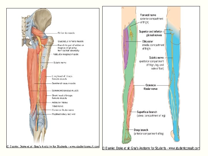 Semitendinosus & long head of biceps have a common origin from the Ischial tuberosity. • Semitendinosus inserted into upper part of medial surface of tibia (SGS) • Muscles inserted into tibia rotate leg medially. • Muscle inserted into fibula rotates leg laterally. • All hamstrings are supplied by tibial nerve (medial popliteal) except short head of biceps by common peroneal nerve (lateral popliteal).