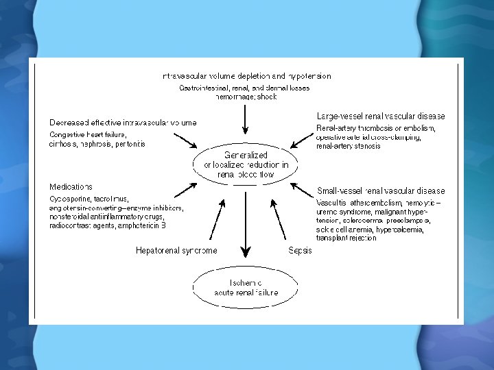 Prerenal Acute Renal Failure • True Intravascular depletion – Sepsis, hemorrhage, overdiuresis, vomiting, diarrhea, burns • Decreased effective volume to the kidneys – CHF, cirrhosis, hepatorenal syndrome, nephrotic syndrome, anaphylaxis • Impaired renal autoregulation – Pre-glomerular (afferent arteriolar) vasoconstriction • Sepsis, Hypercalcemia, Hepatorenal syndrome • NSAIDS, cyclosporine, Amphotericin, epinephrine – Postglomerular (efferent arteriolar) vasodilation • ACE Inhibitors, AT 1 receptor antagonist