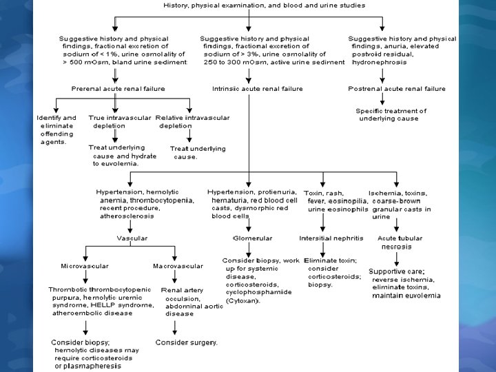 • Is it ARF or acute on chronic renal failure? • Is there renal tract obstruction • Is there a reduction in effective ECF? • Has there been a major vascular occlusion? • Is there parenchymal disease other than ATN?