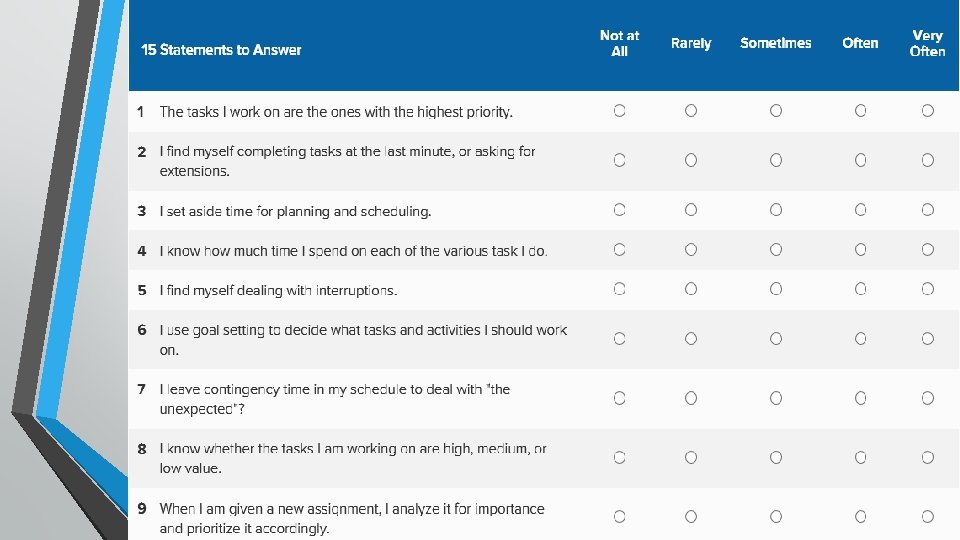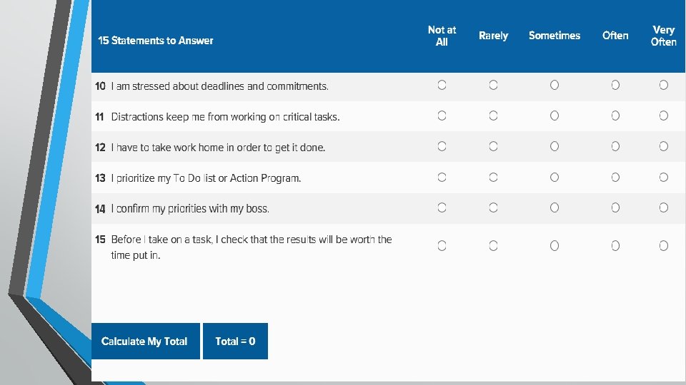 How Did You Do? • Score 15 -30—OMG!. . . The good news is that you have a great opportunity to improve your effectiveness at work and your long term success! • Score 31 -45—Hmmm!. . . You are good at some things, but there is room for improvement elsewhere. • Score 46 -75—Well, Well…You are managing your time very effectively!!!!