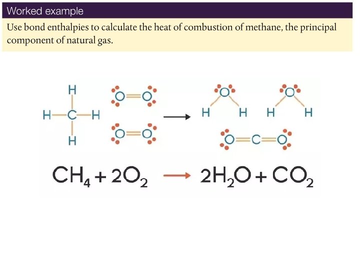 Using bond enthalpies to calculate the enthalpy changes of reactions • We can now hopefully understand which processes are endothermic and exothermic. • We must remember to look at the bonds formed and broken. • Write the balanced chemical equation for the combustion of methane gas, and then draw out the Lewis structures below, counting how many of each type of bond are broken and formed.