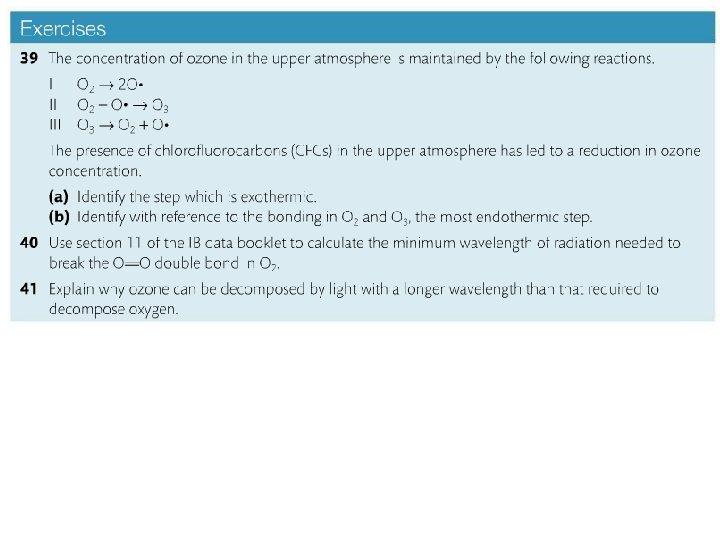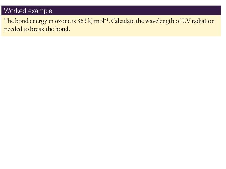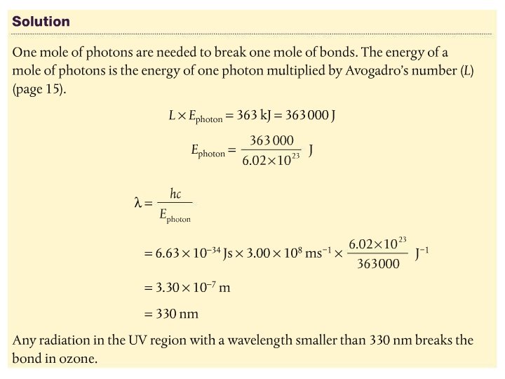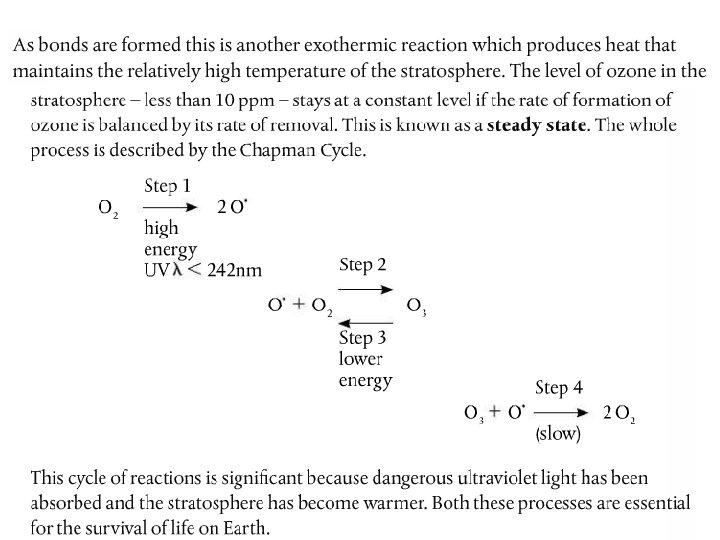 The bonds in oxygen and ozone are broken by UV of different wavelengths • It takes more energy to break the double bond in O 2 than the 1. 5 bonds in O 3 • Physics! Section 2 of data booklet