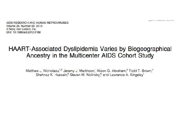Research Question and Hypothesis “ Do genetic variations in human genes involved in lipid metabolism contribute to the development of HAARTassociated dyslipidemia in HIV-positive individuals? ” “If genetic variations in lipid metabolism genes contribute to HAART-associated dyslipidemia, then we would expect dyslipidemia to vary by biogeographical ancestry in HIV positive individuals on HAART. ”