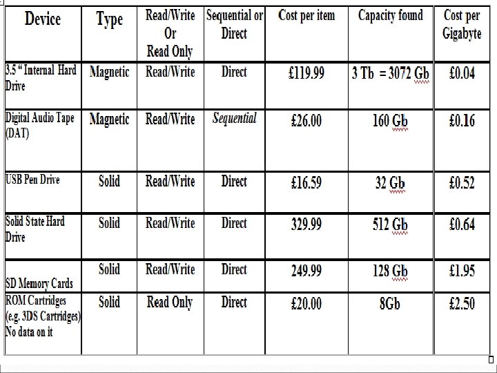 At the computer – www. pcworld. co. uk For each of the backing storage devices find the highest capacity model and note its cost. Cost per Gigabyte = Cost per item/ Capacity found Example: ROM Cartridge: 20. 00 / 8 = £ 2. 50 per Gigabyte Round up to the nearest penny