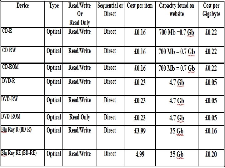 Terms you need to know ROM – Read Only Memory R – Recordable- Record up to the capacity of the disc RW- Rewritable – Write over many times RE - Recordable Erasable (for Blu Ray) Direct – Data can be written and read in any order Sequential- Data can only be read in the order it was written.