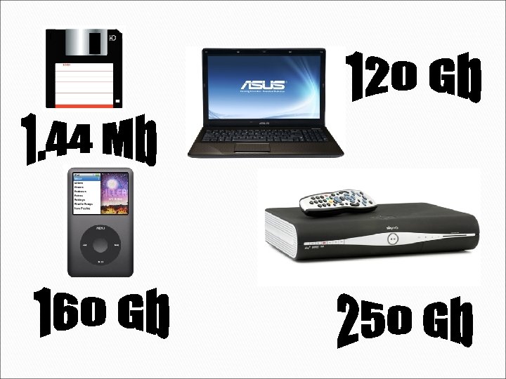 Backing Storage Units 1 bit – the smallest unit of memory 8 bits = 1 byte 1024 bytes = 1 Kilobyte (Kb) 1024 Kb = 1 Megabyte (Mb) 1024 Mb = 1 Gigabyte (Gb) 1024 Gb = 1 Terabyte (Tb) Keep Kilobyte My Garden Megabyte Gigabyte Tidy Terabyte