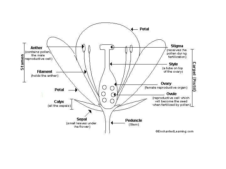 Structure of Flower Ovary: hollow area at base of flower; contains ovules that will become seeds