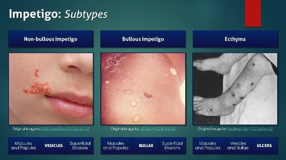 Types : bullous and non bullous Non bullous the crusted ulcerated type usually caused by-- β-haemolytic strains of streptococci. Multiple coalescing lesions on the face and extremities The initial lesions are a clusters of small vesicles or pustules that rupture and become a honeycolored crust. Mild regional lymphadenopathy is commonly present Painless