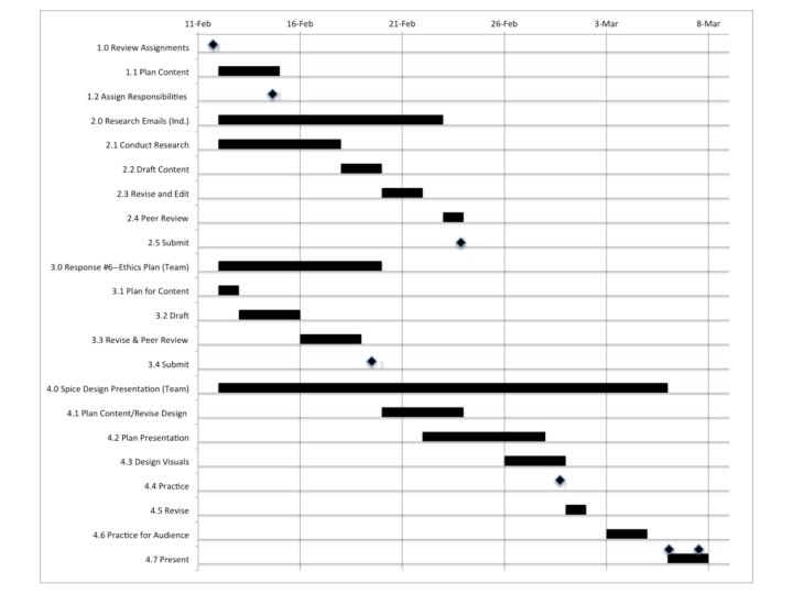 Assignments 1. R#8: Team Ethics and Planning Documents 2. Individual Research Email 3. Team Research/Ethics Memo 4. Team Research/Progress Presentatoin 5. Leadership Memo 6. Educational Design Review Presentation Other: Responses 9 & 10 + optional; Action Portfolio #2 (5 action plans); Career Development Presentation; Revised job packet (optional)