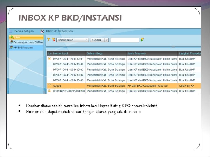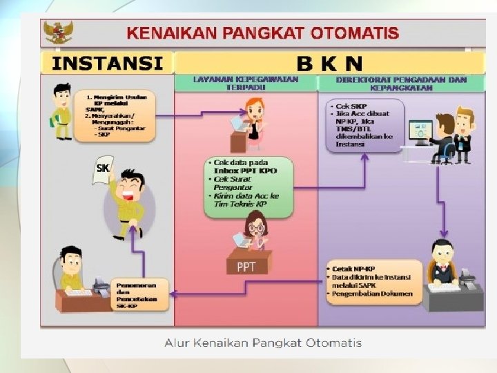 KENAIKAN PANGKAT LESS PAPER o o o • Hanya untuk Kenaikan Pangkat Reguler. • Mekanisme kenaikan pangkat Pilihan, KPLB, Anumerta, Pengabdian Masih tetap Sama. • Perubahan Pendidikan Harus Mencantumkan Nomor Persetujuan BKN o • Kenaikan Pangkat ke III A, IV A, dilakukan dengan peningkatan pendidikan, Ujian Dinas o • Penyesuaian ijazah tidak termasuk KPO o • Pembatalan di Imbox 10 hari o • Pembatalan lebih 15 hari usul baru ke BKN o • Kelengkapan bahan di sampaikan melalui loket pelayanan 7