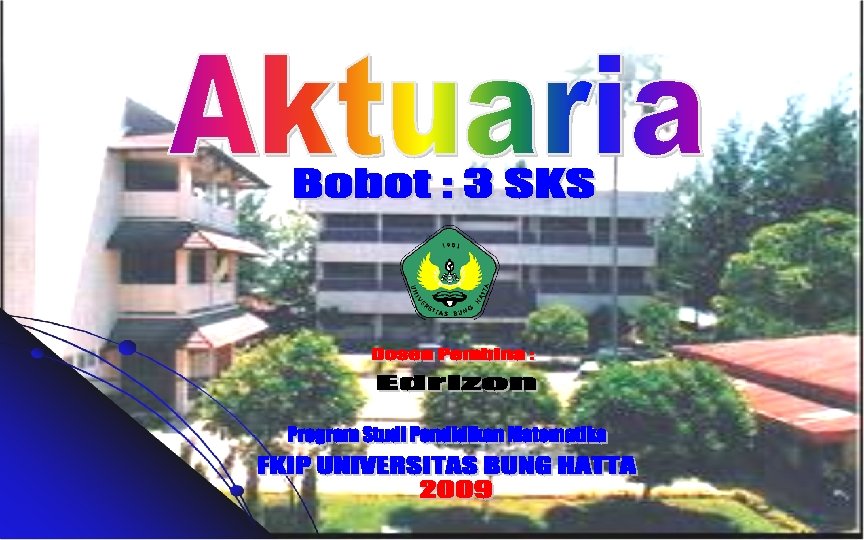 Bahan Ajar Aktuaria Program Sudi Pendidikan Matematika FKIP Univ. Bung Hatta Pengantar Home Tujuan Buku Rujukan Kegiatan Perkulihan Evaluasi Silabus @ 2009 by Edrizon PROGRAM STUDI PENDIDIKAN MATEMATIKA FAKULTAS KEGURUAN DAN ILMU PENDIDIKAN UNIVERSITAS BUNG HATTA Nama Mata Kuliah Kode Mata Kuliah Semester/SKS Disajika pada Dosen Pembina : Aktuaria : 338 843 : VII (Tujuh)/ 3 Sks : Prodi Pendidikan matematika : Edrizon