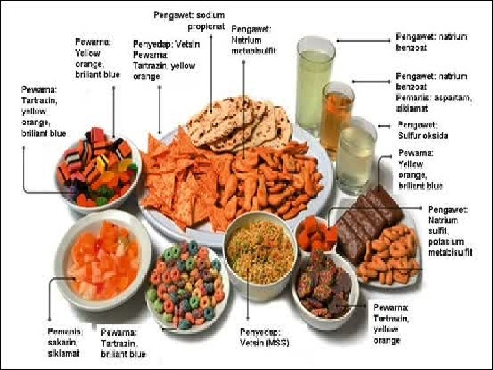 Definisi. . . Bahan tambahan makanan Bahan yang ditambahkan ke dalam makanan untuk tujuan tertentu selama proses pengolahan maupun penyimpanan yang dapat mempengaruhi karakteristik produk pangan Kimia Pangan II (2014) – Adelya Desi, STP. M. Sc.