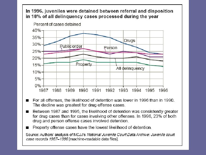 Bail Raises Difficult Questions about the Juvenile Court • If we have a bail system, why then have a juvenile court? Isn’t the purpose to use the law’s teeth to protect children, not just ensure that they make their court date? • Doesn’t a bail system reproduce the same inequalities for juveniles as for adults? Isn’t it double punishment for children (poor parents lead to delinquency, then poor parents increase risk of detention)? • Presumption of guilt • Remedial value of detention?