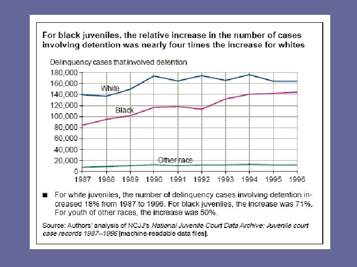 Impacts of Detention • Strongest predictor of severity of sentence (disposition) • Primary source of racial disparities and disproportionate minority confinement • Unregulated punishment – generally poor services, poor staff, chaotic and violent places • Remediation – race-blind screening, alternatives to detention, development of standards that invite regulation (See, Feld, at 355 -7