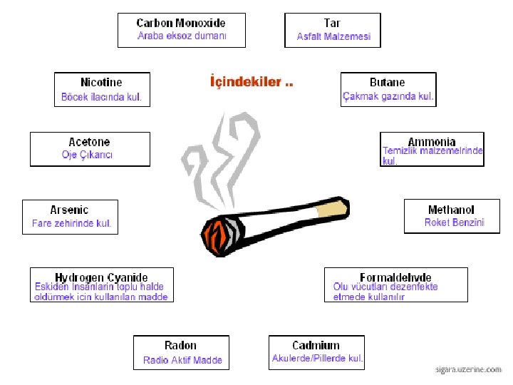 Sigaranın Neden Olduğu Hastalıklar Kalp krizi, Kangren, Damar tıkanması, Kulak enfeksiyonları, Kısırlık, Yemek borusu kanseri, Erken yaşlanma, İyileşme zorluğu, Diş kaybı, Bağımlılık, Sırt ve Bel ağrısı, Çocukluk solunum problemleri, Şeker hastalığı, Prostat, Göğüs, Rahim, Boğaz, Mide, Karaciğer ve Ağız Kanseri vb.