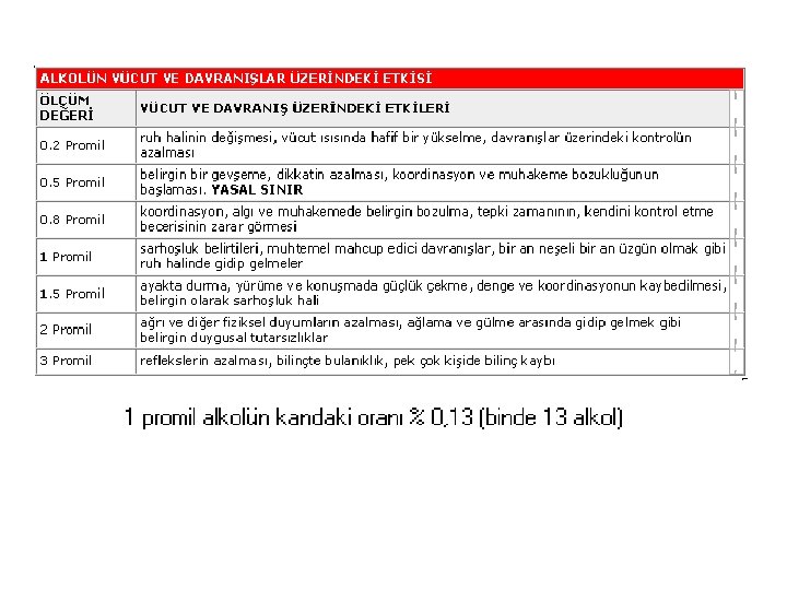 Alkol Bağımlılığı Nedir? Niyetlendiğinden daha fazla miktar ve sürede alkol almak. Örneğin kişi bir bardak içmek için başlar, ama bir şişe bitirmeden kalkamaz. 2. Kişi bırakmayı istediği ya da defalarca bırakmayı denediği halde yeniden içmeye başlar. Zaman zaman bir kaç gün ya da ay içmeyebilir. Bunu ‘istediği zaman bırakabildiğinin' kanıtı olarak göstermeye çalışabilir. 3. İçkiye fazla vakit ayırır. Bazıları gün içinde kimseye fark ettirmemeye çalışarak içebilir. 4. İçki içmeye fırsat bulamadığı sosyal faaliyetleri, hobileri, başka zevk verici aktiviteleri azaltır ya da terk eder. 5. Alkole bağlı ya da alkolle artan fiziksel (karaciğer hastalığı, yüksek tansiyon, gastrit vb), ya da psikolojik (depresyon, anksiyete, uyku bozukluğu vb) problemler yaşamasına rağmen içmeye devam eder. 6. Aynı etkiyi almak için içtiği miktarı arttırır ya da başkaları için çok sayılacak miktarlarda içtiği halde etkilenmez (bunu, yanlış olarak iyi bir şeymiş gibi, alkole dayanıklı olduğunun kanıtı olarak öne sürebilir). 7. Alkol almadığı zaman titreme, terleme, çarpıntı gibi şikayetler yaşar. 1.