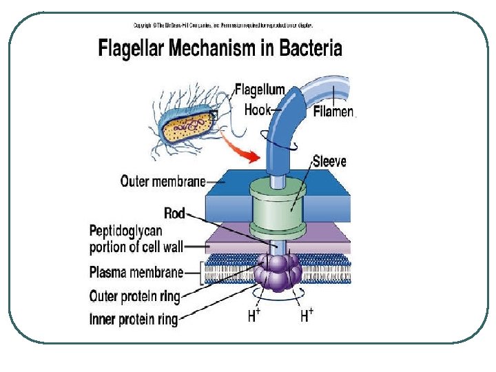 Sistem pelekatan flagel l l Melekat pada membran sel, Kecepatan berputar : 3000 putaran/menit Bacillus megatorium 1, 6 mm/mt Vibrio colerae 12 mm/mt Tipe flagel dan gerakannya : • Monopolar – monotrik • Monopolar – politrik • Dipolar – monotrik • Dipolar -- politrik • Proteus