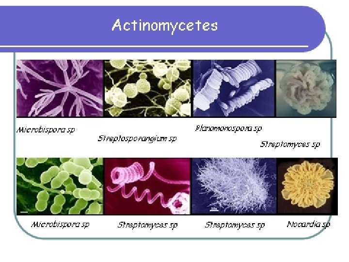 ACTINOMYCETES l l l Bakteri berbentuk filamen / benang Pada umumnya penghasil antibiotik Actynomycetes terdiri dari : • Streptomyces: streptomisin • Actinomyces