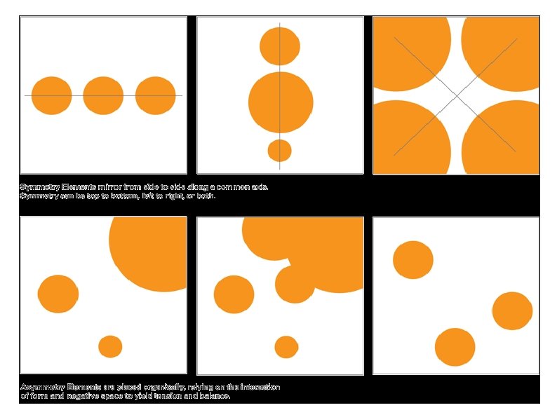 Design Problem 1 1. Working in 3 6 x 6 inch squares, arrange three or four geometric elements (circles, squares, rectangles, triangles, etc) in a symmetrical way. Start with variations in which all the elements are the same size, then create symmetrical designs with elements of different size. Experiment with scale and cropping. 2. Create 3 6 x 6 asymmetrical designs using forms of different sizes. Experiment until you find visual balance in each composition. For example, use several small elements to offset one larger one. 3. Many variations are possible. Introduce contrasts of color or value.