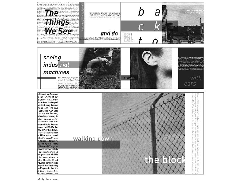 Design Problem 2 1. Cut a. 5 -inch square cleanly through a magazine, yielding dozens of unexpected compositions. Select ten of these small squares to use as imagery in an accordion book. 2. Scan the squares at 200% and place them into a page layout file (formatted in 5 -inchsquare pages). Pair the images with a text gathered from Wikipedia. 3. Create a visual "story" by considering the pacing and scale of the images and text within each spread and across the entire sequence.