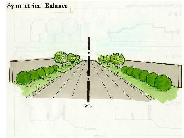 CENTRAL AXIS • An imaginary line that divides the picture plane evenly in half • We always assume a horizontal balance with a center vertical axis with the left and right sides achieving a sense of equilibrium. • Also a vertical balance with a horizontal axis dividing top and bottom.