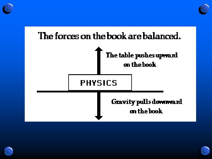 o The force of gravity pulling downward and the force of the table pushing upwards on the book are of equal magnitude and opposite directions. o These two forces balance each other.
