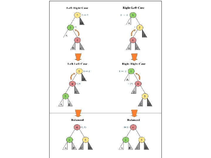 AVL Rotations • Four cases to consider, cases 1 to 4: 1. RR (right-right) Single rotation to left 2. LL (left-left) Single rotation to right 3. RL (right-left) Double rotation 1. One rotation to get to case 1 2. Then case 1 4. LR (left-right) Double rotation 1. One rotation to get to case 2 2. Then case 2 Insertion sequence: RR) 1, 2, 3 LL) 3, 2, 1 RL) 1, 3, 2 LR) 3, 1, 2