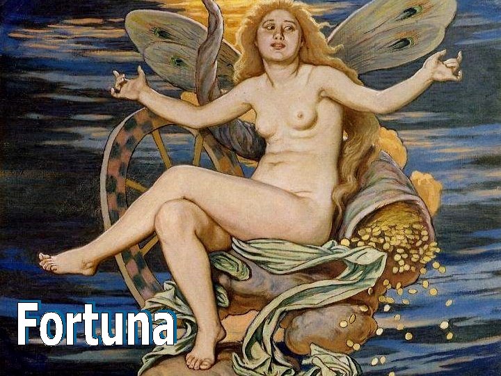 Lady Fortune appears in chapter 25 of Machiavelli's The Prince, in which he says Fortune only rules one half of men's fate, the other half being of their own will. Machiavelli reminds the reader that Fortune is a woman, that she favours a strong, or even violent hand, and the she favours the more aggressive and bold young man than a timid elder. Albrecht Dürer, Fortuna , 1502