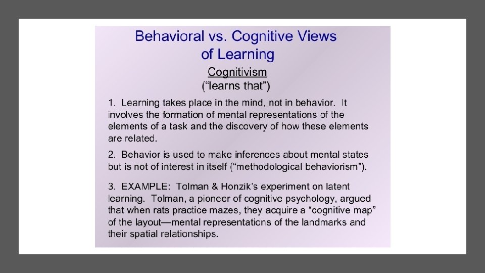 Cognitive Learning that depends on mental activity that is not directly observable Involves such processes as attention, expectation, thinking, and memory