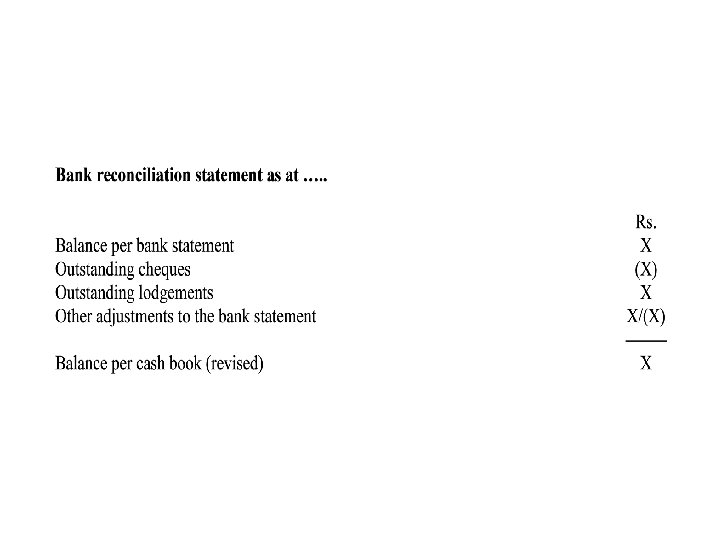 • The bank statement balance needs to be adjusted for these items: Rs. Balance per bank statement X Less: Outstanding/unpresented cheques (X) Add: Outstanding/uncleared lodgements X ––– Balance per cash book (revised) X