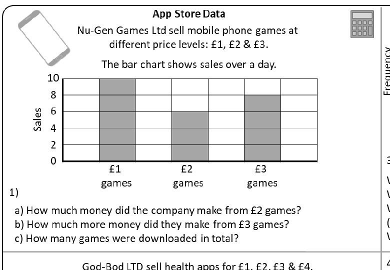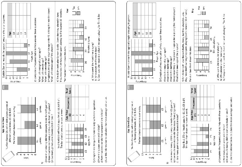 Frequency Bubble Games records the ages of people who play its games. 30 25 Age 20 10 15 11 10 12 5 13 0 10 11 12 13 Player Age 3) Complete a frequency table to help answer these questions: The bar chart shows sales over a day. 10 8 6 4 2 0 £ 1 games 1) £ 2 games £ 3 games What is the range of player ages? What is the mode age? What is the median age? (imagine putting all the players in age order & picking the middle player) What is the mean age of the players? a) How much money did the company make from £ 2 games? b) How much more money did they make from £ 3 games? c) How many games were downloaded in total? 4) Tim & Jim both play Berserk Battle. Every day they played in June, they recorded how long they spent playing (to the nearest 10 minutes). Frequency God-Bod LTD sell health apps for £ 1, £ 2, £ 3 & £ 4. The bar chart shows sales over a week. 12 10 8 6 4 2 0 £ 1 £ 2 £ 3 App Price £ 4 App Price Frequency (£) 1 2 3 4 2) Complete the frequency table to help with these questions. a) How many apps were sold in total? b) How much money did the company make in total? c) Use this information to calculate the mean average sale value. Total Spent The dual bar chart shows this data. Frequency Sales App Store Data Nu-Gen Games Ltd sell mobile phone games at different price levels: £ 1, £ 2 & £ 3. Key 6 Tim 4 Jim 2 0 20 30 40 Minutes playing 50 a) Who spent the most time playing? b) Who played on the most days? b) Compare the mean & median time spent playing for Tim & Jim
