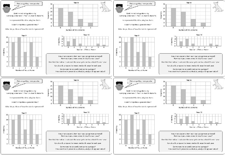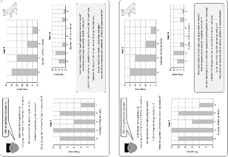 Pets are getting more popular. Year 9 30 Matt tested his hypothesis by surveying some Year 7, Year 9 & Year 11 students. He represented the data using bar charts. Is Matt’s hypothesis generally true? Frequency 25 20 15 10 5 0 0 What do you think of how the data is represented? Year 7 Frequency 12 Frequency 10 8 1 2 Number of Pets at Home 16 12 8 4 0 3 Year 11 0 1 2 3 4 Number of Pets at Home 5 6 6 How many students from each year group were surveyed? How many pets were owned in total for each year? 4 2 Use this information to calculate the mean pets-per-household for each year. 0 Calculate & compare the mean, median & range for each year. 0 1 2 3 Number of Pets at Home 4 Do we need to be careful comparing averages? How could we improve data collection, analysis & representation?