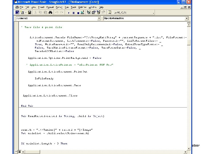Chain of events 1. Shop adds a request on a dataque 2. Win 2 K server reads the request 3. An XML document is created 4. Word is loaded 5. XML document is parsed 6. VBA script sets data into the layout of. dot 7. Word prints to a pdf print driver 8. Jmail component is used to send e-mail