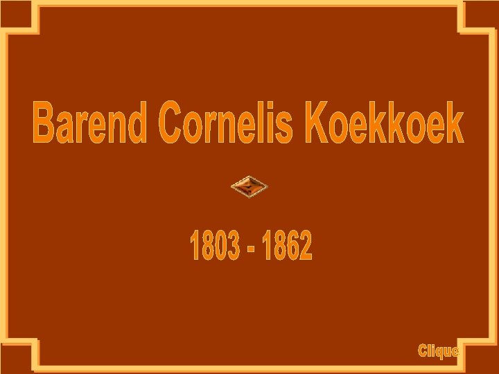 Pintor Holandês Middelburg, 1803 - Kleve, 1862 Barend Cornelis Koekkoek, sem sombra de dúvida, foi o pintor mais importante de paisagens do movimento romântico holandês. Durante sua vida veio a ser conhecido como " Príncipe da pintura paisagística" e desempenhou seu papel como líder e excelência neste gênero. Nasceu em 1803 na cidade de Middelburg. Inicialmente recebeu ensinamentos do seu pai Johannes Hermanus Koekkoek (1778 -1851), que era um artista talentoso em marinhas. Barend foi o mais famoso dos artistas de sua dinastia. Aprimorou seus estudos e a técnica na Academia de Middelburg e também na Academia das Artes em Amsterdam. Foi grande sua influência nos pintores do século XVII, tais como Hobbema e Wijnants. Koekkoek transferiu-se para Kleve em 1834. A paisagem do Reno foi um cenário perfeito que muito combinava com o seu estilo. Foi em Kleve que o estilo de Koekkoek alcançou a maturidade. O artista teve muitos patrocinadores ricos das classes abastadas da Holanda. Em 1839 o rei Willem III comprou à vista e pagou caríssimo por uma pintura enorme que retratava uma floresta em Cattle‘, quadro esse que ganhou uma medalha de ouro no Salão de Haia, naquele mesmo ano. O Tsar russo Alexander II ficou impressionado com os trabalhos magníficos do artista e encomendou um quadro com as mesmas características daquele premiado. Koekkoek ganhou reputação internacional. Entre 1826 e 1862 Koekkoek era um expositor regular em Haia, Rotterdam e Amsterdam, ganhador de medalhas no Salão de Paris em 1840 e em 1845. Foi consagrado pela alta sociedade de Amsterdam e agraciado pela Academia de São Petersburgo. A ele foram concedidas ainda, as medalhas da Ordem do Leão dos Países Baixos e da Ordem Belga de Leopold.