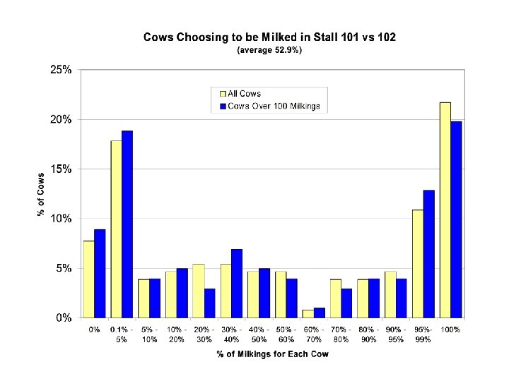 3 months of data from 12 herds 1165 cows 38. 7 % Cross Use 25 20 % of cows in this robot use group 19. 7 % selective use 15 10 5 0 1 to 10 10 to 20 20 to 30 30 to 40 40 to 50 50 to 60 60 to 70 70 to 80 80 to 90 90 to 100 % of total milking visits to robot 1