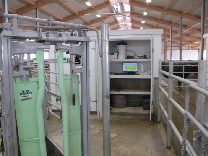 Boumatic : self contained, milks between the rear legs, exit both sides of the box Easy route with no turns for separation and milking special needs cows.