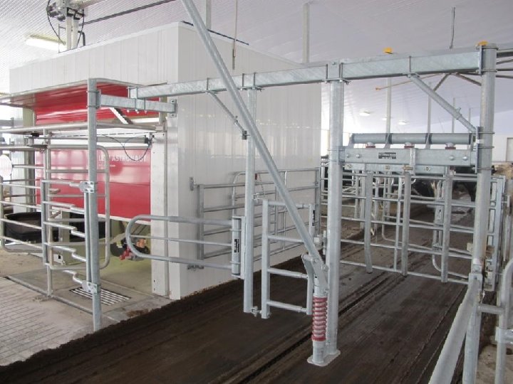 - 20 feet from the milking box to the first freestall (also adds more manger and headlock space) - Locate cow brushes, pasture selection gates, and computer feeders far away from this area to spread out barn activity